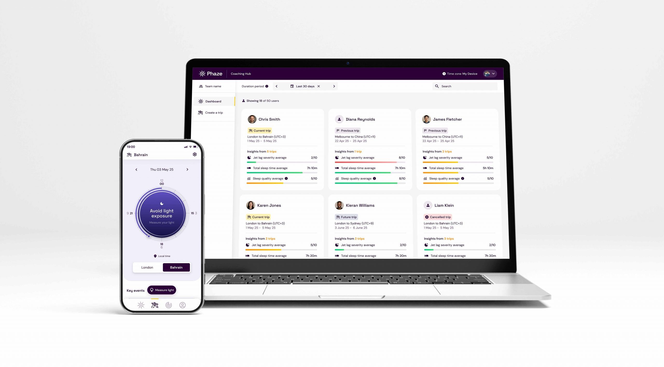 Whether you travel once a year or every week, Phaze helps you manage readiness before, during, and after travel. It combines baseline data, real-time insights, and contextual schedules – so coaches can personalise routines and optimise performance at scale.