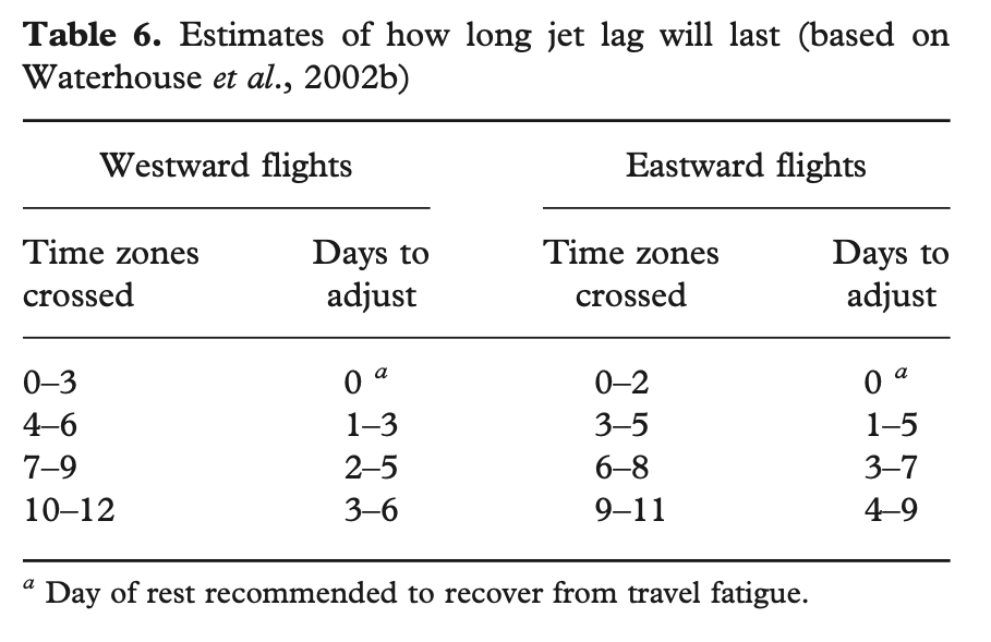 Peer-reviewed consensus papers suggest that the body clock can adjust at a rate of approximately one to two hours per day for each time zone crossed, with eastward travel generally requiring a longer adaptation period than westward travel (1;2). This means that a player travelling eight to ten time zones east may still be adapting well into the second week post-arrival.